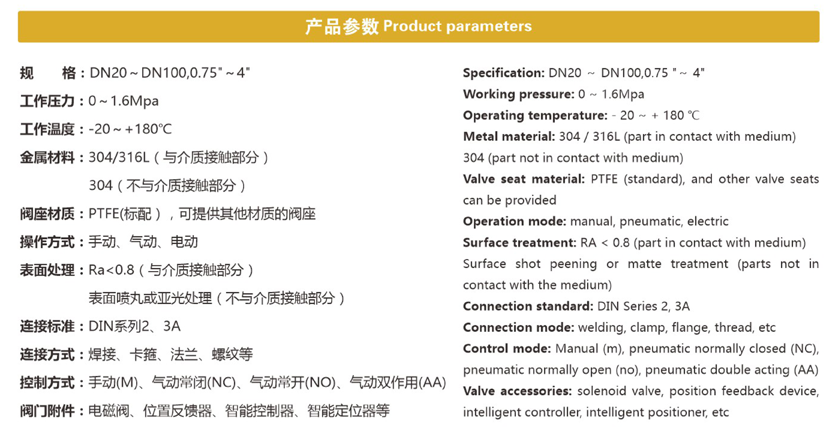 卫生级物料的输送物料管得切断及控制,完全贯通的阀腔设计不会产生任何流体阻力,适用于用来处理粘性物料。同时,多种阀座材料可供提供,适用于不同工况的使用温度。
