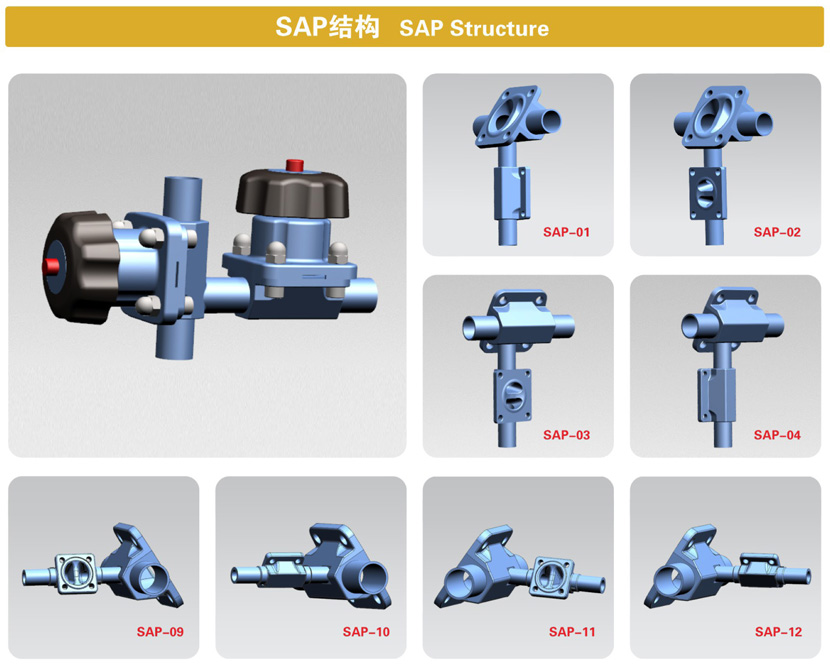 SA或GMP阀门(Good Manufactuning Practice的缩写)主要用于水平管路系统中。主阀放置要保持一定的自排空角度,通路孔在主阀水路的最低排放点,这种阀主要运用,取样、蒸汽、冷凝或者转向口上。 对于该阀结构形式,无论主阀或是通路阀或者分管口,其最大通径DN125(5'')。 下图给出的是一些可能的SAP连接结构。
