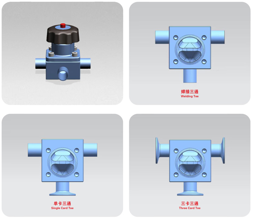 T型三通一体式隔膜阀是按生产工艺在管道上进行采样及并流或做用水点使用。符合GMP要求,阀门安装在环形管道上使用。确保在用水点做到无死角。密封材料采用进口PTFE+EPDM分体式双膜片,更加卫生洁净。阀门有限位装置,保证在开关时对膜片的损坏,T型三通一体式阀门是目前生物制药、食品、饮料等广泛使用的卫生级阀门。